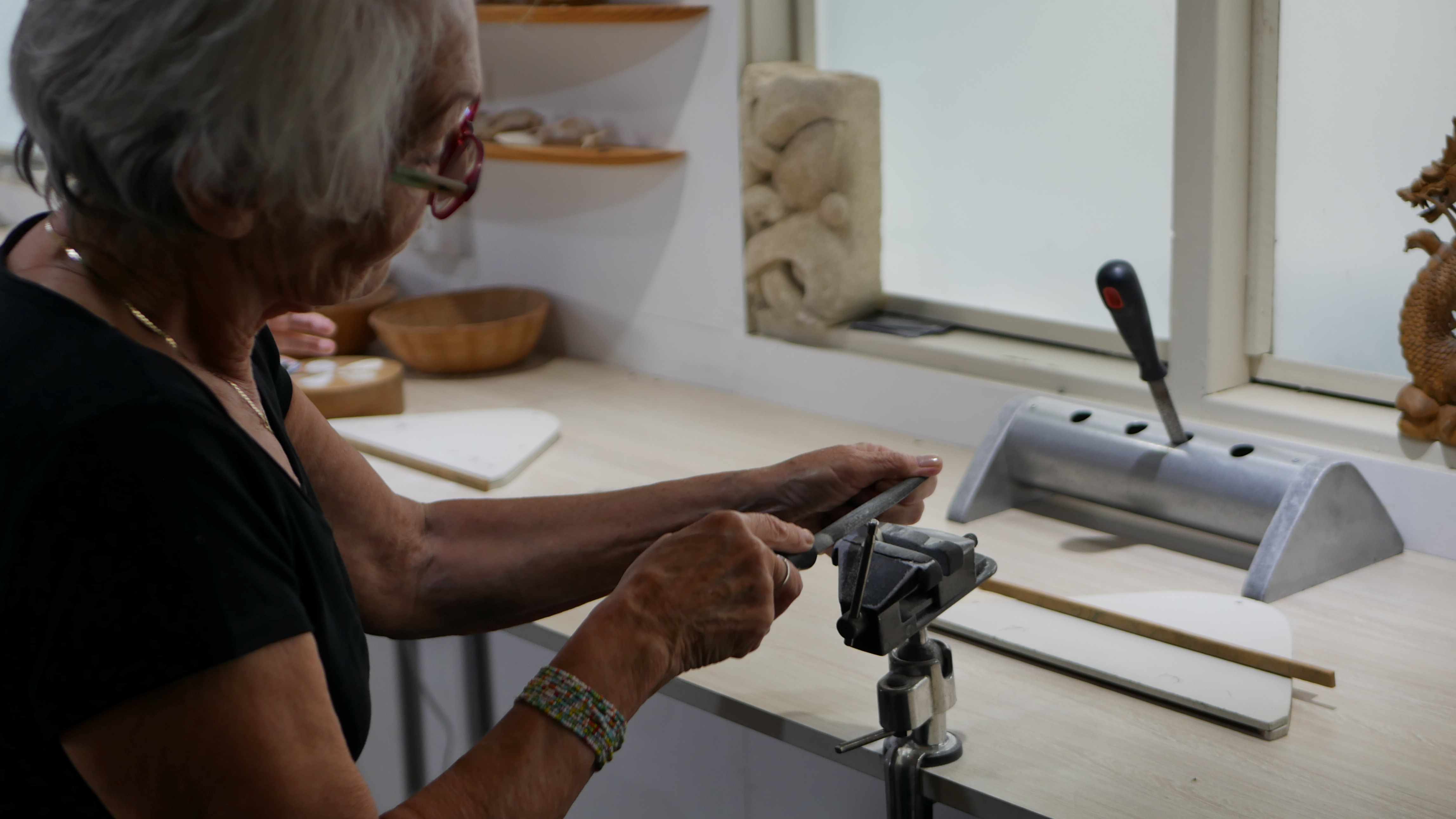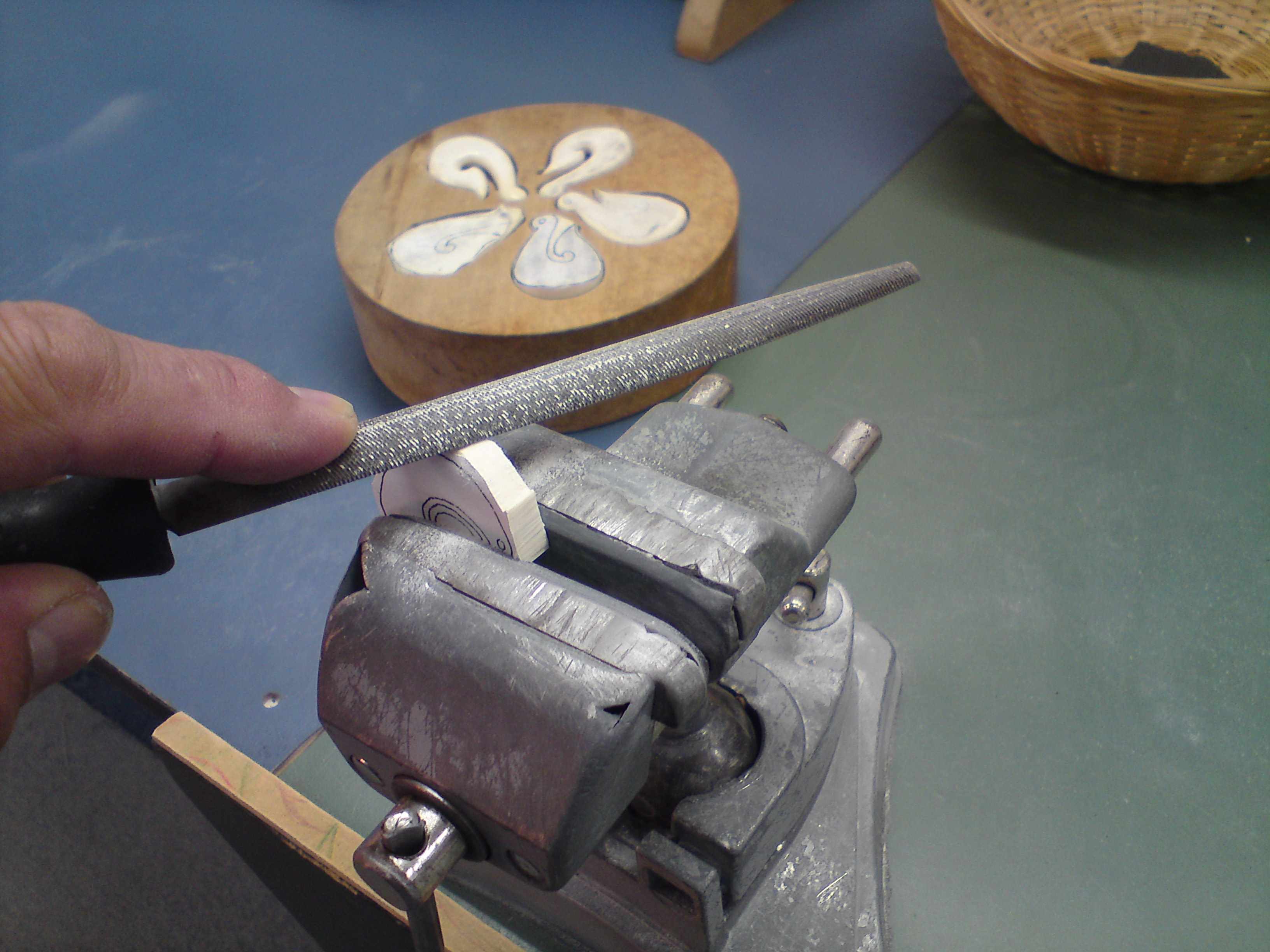 Once I have the right shape, it's time to round out the edges and Fraser shows me how to file around the sides moving the piece of bone in the vice to change the angles.