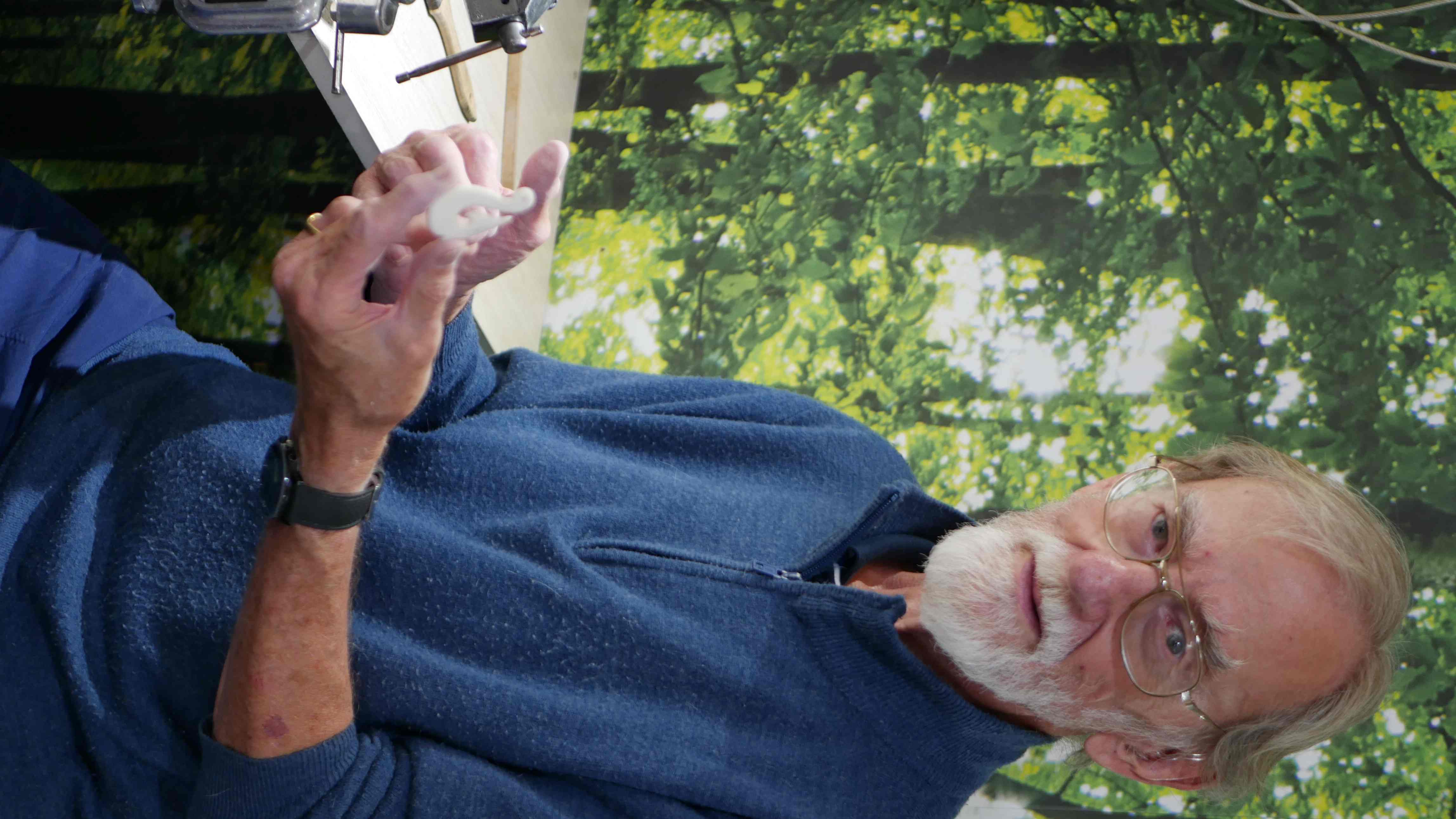 Fraser takes over with an electric burr that shapes the fine hook feature and creates the loop. After that there’s more sanding, weaving thin strips of paper back and forwards through the loops and over the hooks.