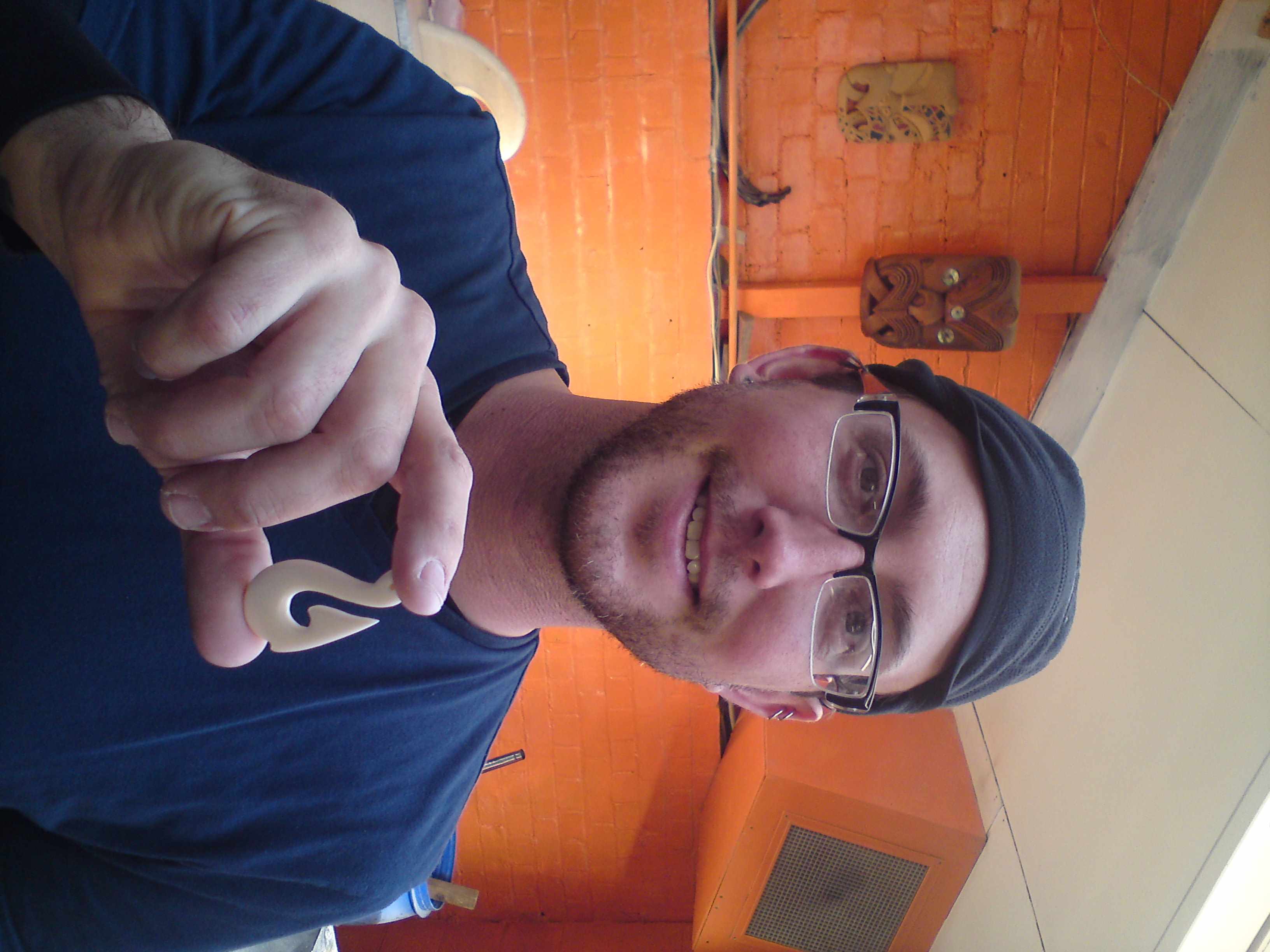 WILL GUTENDORF is grinning like the Cheshire cat. After two hours of careful carving, sanding and polishing, the American visitor has his own fishhook-shaped bone carving.