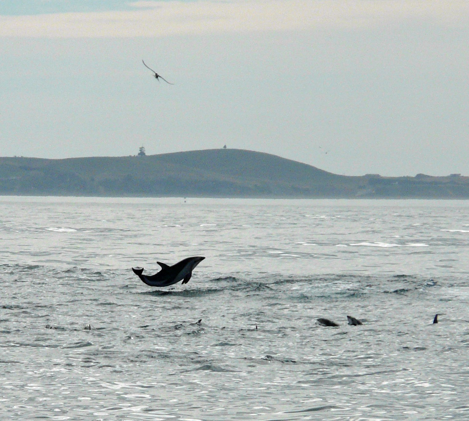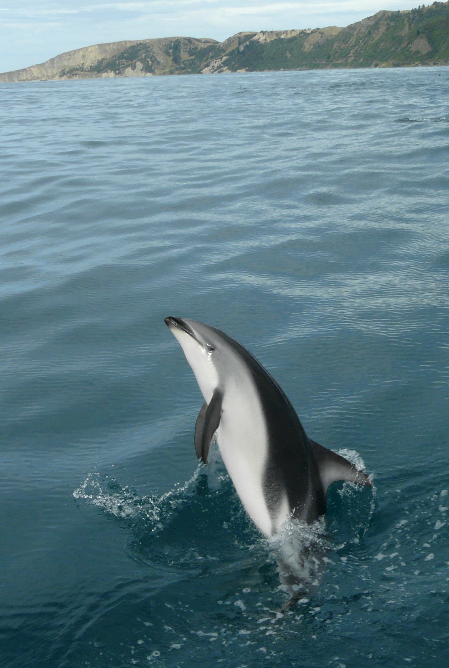 As if on cue, a Dusky dolphin leaps from the water beside the boat and proceeds to dance across the water slapping his fins.