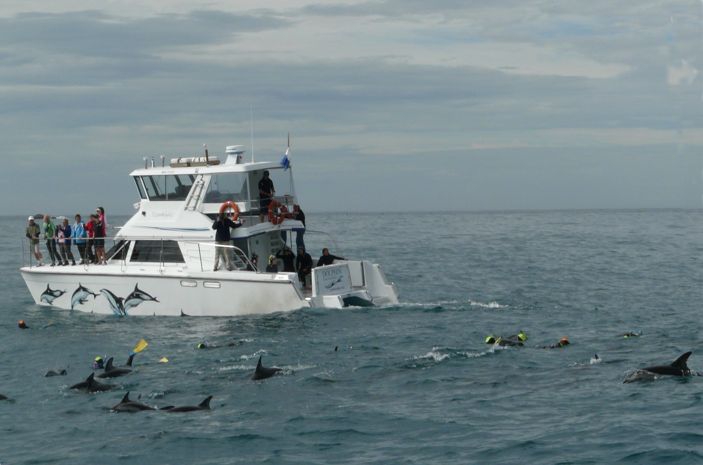 We’re a mixed bag that’s signed up for this morning’s swim-with-the-dolphins experience. We join a big group of French, German and English tourists eager to don wetsuits, masks and fins to brave the 16oC water and get up close and personal with some of Kaikoura’s more enduring residents.